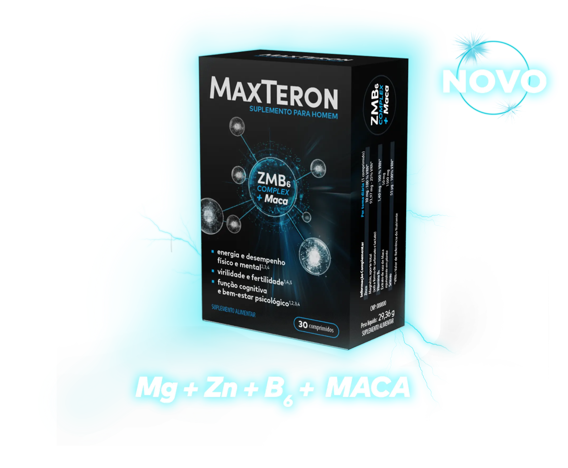 A sinergia do Zinco, Magnésio e Vitamina B6 (complexo ZMB6), presentes na formulação de MaxTeron, contribuem para apoio dos níveis de testosterona, da função muscular e do metabolismo energético.